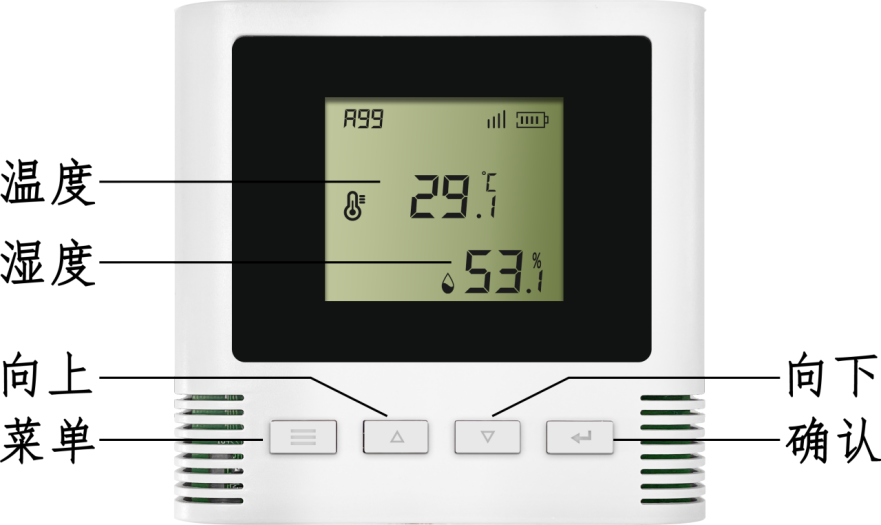 1. 主顯示界面為:溫度及濕度當(dāng)前值、SIM信號(hào)強(qiáng)度、電池電量信息。