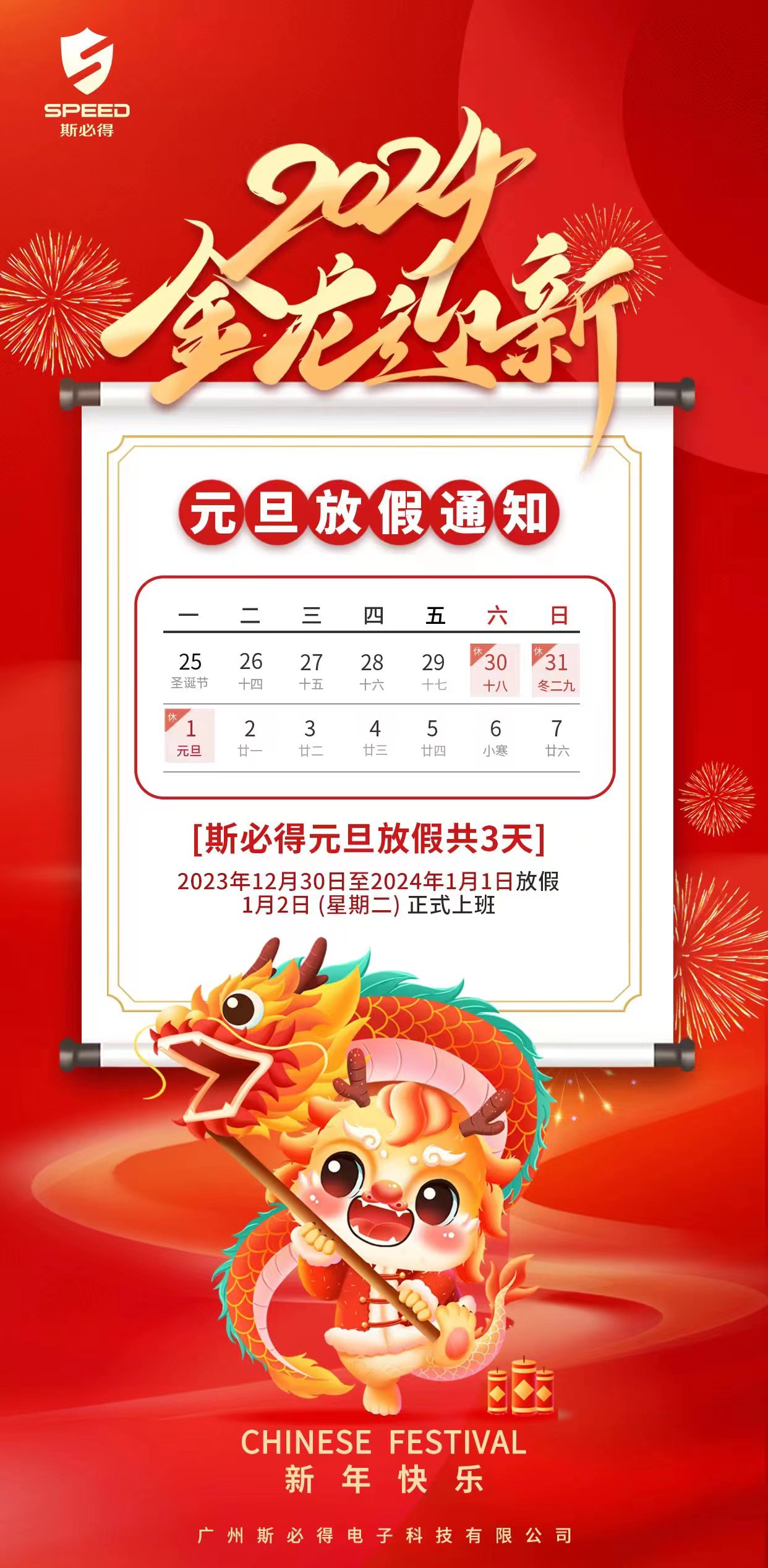 在2023年12月31日23時59分59秒,伴隨這鐘聲響徹夜空的時候,我們迎來了一個充滿期待的2024年,值此佳節(jié)之際,謹(jǐn)代廣州斯必得電子科技有限公司,向所有的新老客戶、合作商、全體員工表示衷心的感謝,祝愿大家在2024年里,工作順利、心想事成、生活如畫。