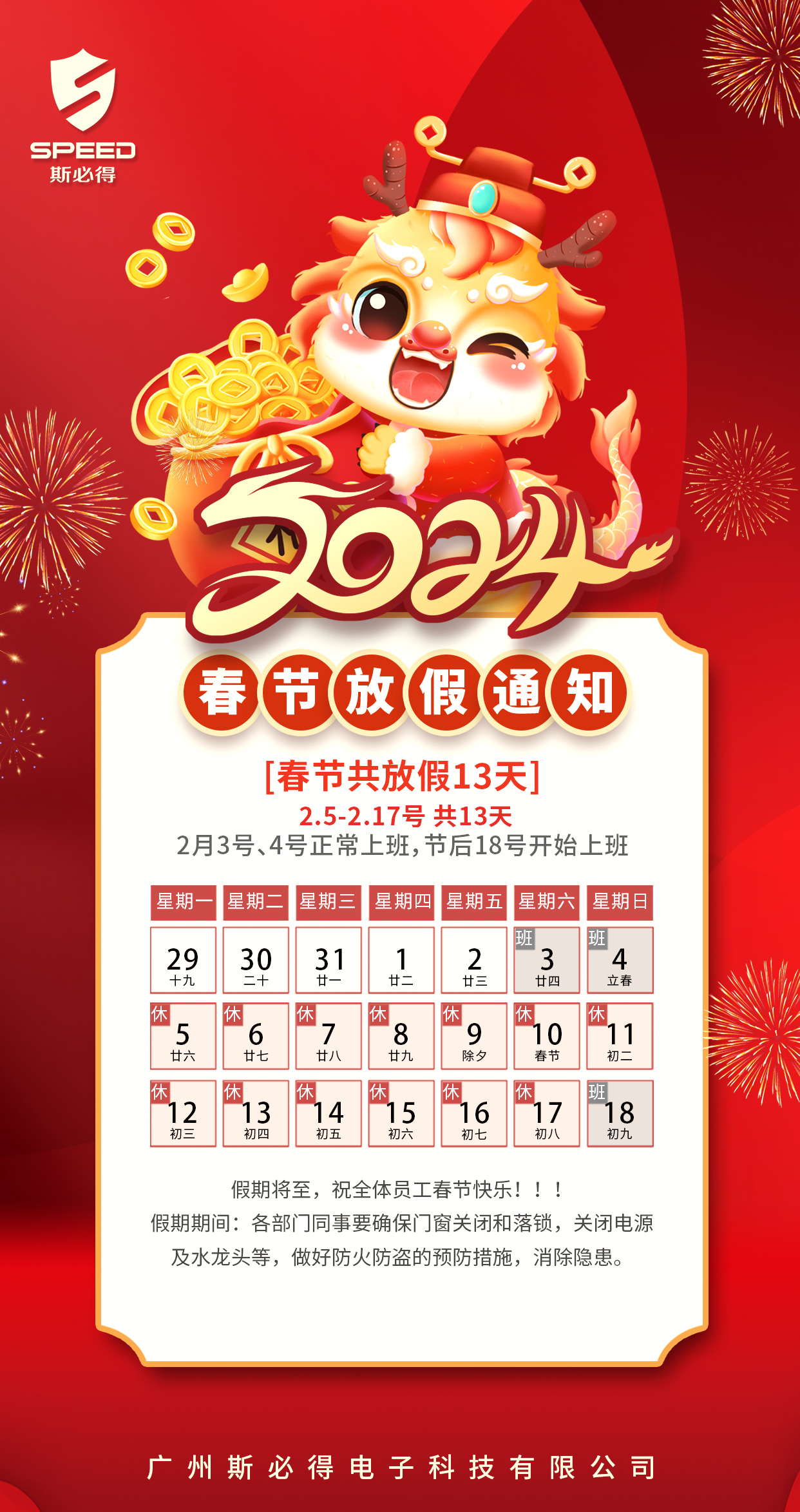 2024年新春佳節(jié)即將來臨,在此先預(yù)祝全體用戶、集成商、員工新春快樂、生意興隆、萬事如意!非常感謝您長(zhǎng)期以來對(duì)我們工作的"理解與支持。根據(jù)國(guó)務(wù)院發(fā)布的法定節(jié)假日放假安排,結(jié)合我司實(shí)際情況,2024年春季放假具體安排通知如下: