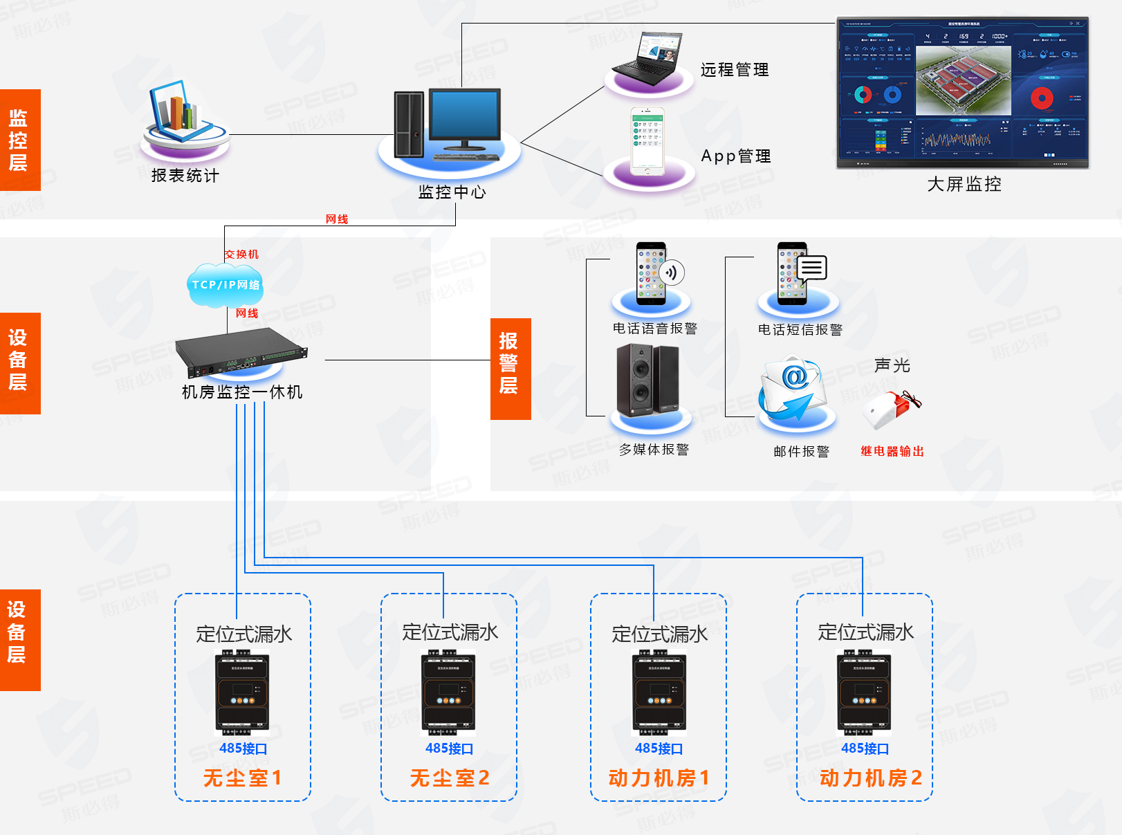 由于南方天氣雨水較多,導(dǎo)致部分機房及重點區(qū)域出現(xiàn)水浸現(xiàn)象,導(dǎo)致部分設(shè)備損壞,影響公司的正常運營,因此要求對于現(xiàn)有的東莞分公司所涉及的動力機房以及無塵室要求增加漏水監(jiān)控管理功能,且必須要能定位到區(qū)域,可遠程實時監(jiān)控情況,漏水報警功能要求有電話、短信、APP等。
