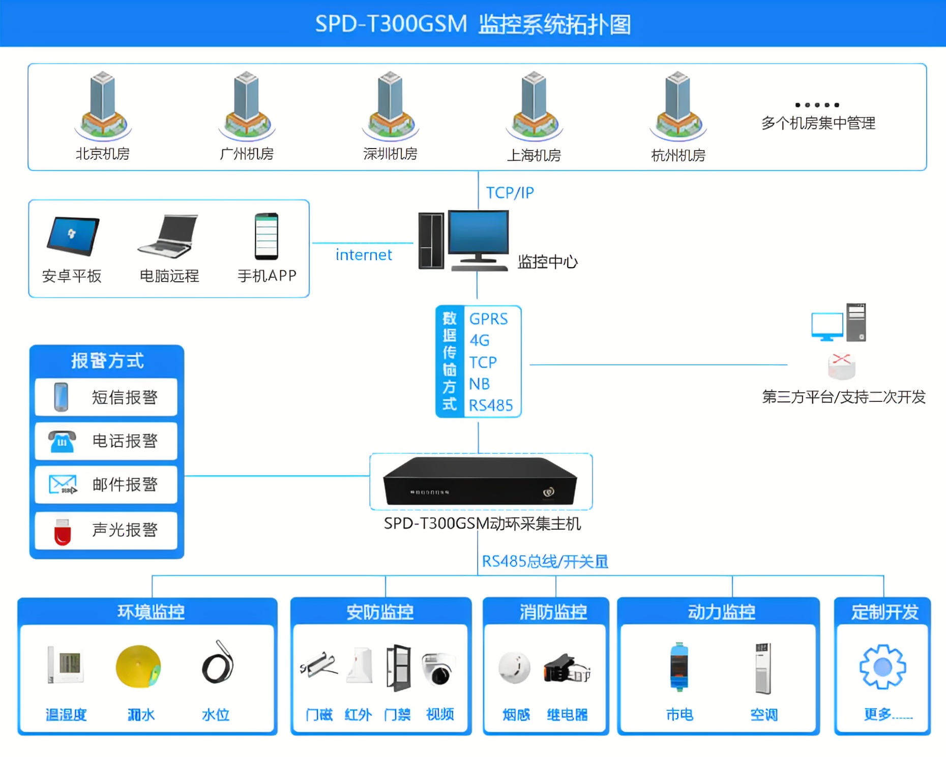 動(dòng)力環(huán)境監(jiān)控系統(tǒng)常規(guī)功能首先涵蓋了全面監(jiān)測(cè),如織就一張細(xì)密無(wú)間的安全網(wǎng),對(duì)電源UPS、電池組、三相電、市電、空調(diào)、溫濕度、門(mén)禁、視頻、水浸、消防等關(guān)鍵要素進(jìn)行24小時(shí)不間斷的監(jiān)控,任何細(xì)微波動(dòng)都難逃其法眼。而其智能告警功能如同敏銳的哨兵,一旦發(fā)現(xiàn)異常狀況,立即通過(guò)APP、微信、電話、聲音、短信、郵件等多種方式向管理人員發(fā)出緊急警報(bào),確保問(wèn)題能夠被迅速發(fā)現(xiàn)并處理,有效避免潛在風(fēng)險(xiǎn)升級(jí)為實(shí)際故障。